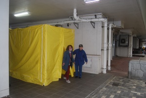 第2回防災フェア。起震体験。3号棟前の埋設トイレの見学など実施。(2005/10/23)